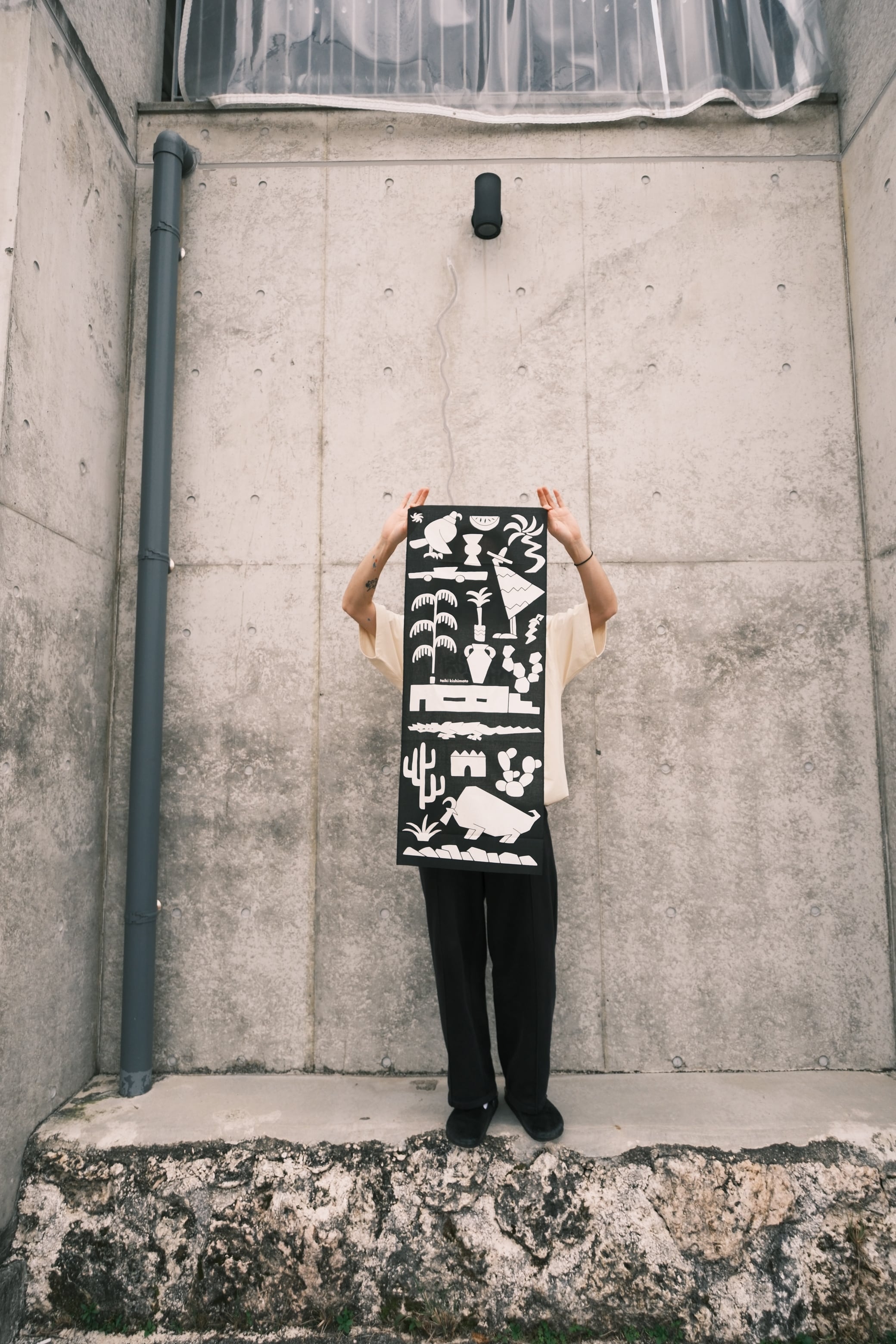 異国を旅して出会う様な動物や植物、建物をモチーフにしたshapeが組み合わさったデザイン。